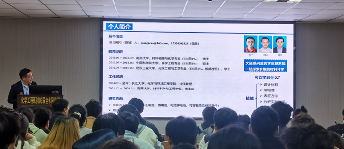 讲座由主题讲解与师生问答两部分组成。开场时,赖璐副经理向大家简要介绍了主讲人王昭老师。王昭老师来自湖北麻城,是中共党员,2021年毕业于南开大学材料物理与化学专业并取得博士学位,随后在南开大学从事博士后研究至2024年2月,同年受聘英国上市公司官网365“学科菁英人才(特任教授)”岗位,主要从事新能源材料与器件(水系电池、微电池、可拉伸电池、可穿戴柔性储能器件)以及相变储能材料的研究工作。