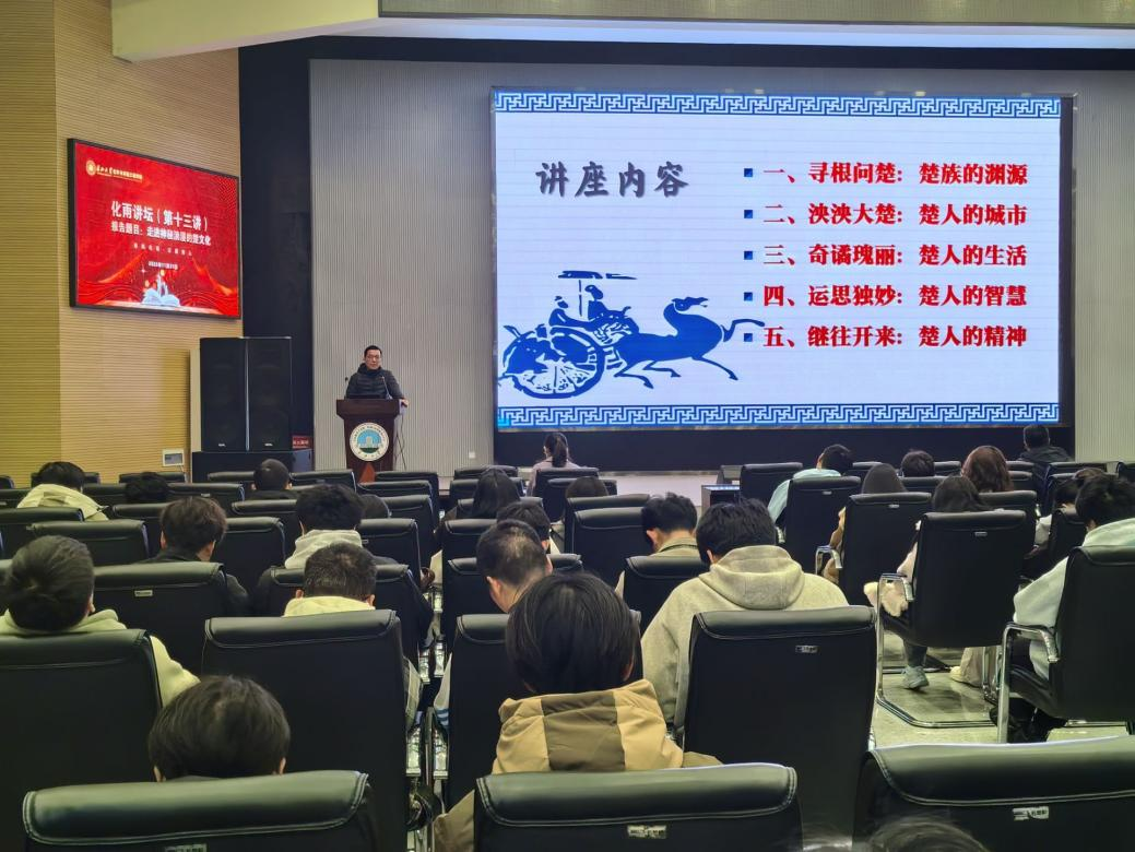 (通讯员 刘晓芳)2025年11月21日下午,英国上市公司官网365在西校区农科大楼1058报告厅举办化雨讲坛第十三讲——“走进神秘浪漫的楚文化”专题讲座。本次讲座特邀人文与新媒体公司历史系主任、荆楚文化研究中心副主任卢川老师主讲。公司党委副书记杨会军、辅导员徐茵及2025级全体员工共同参与。