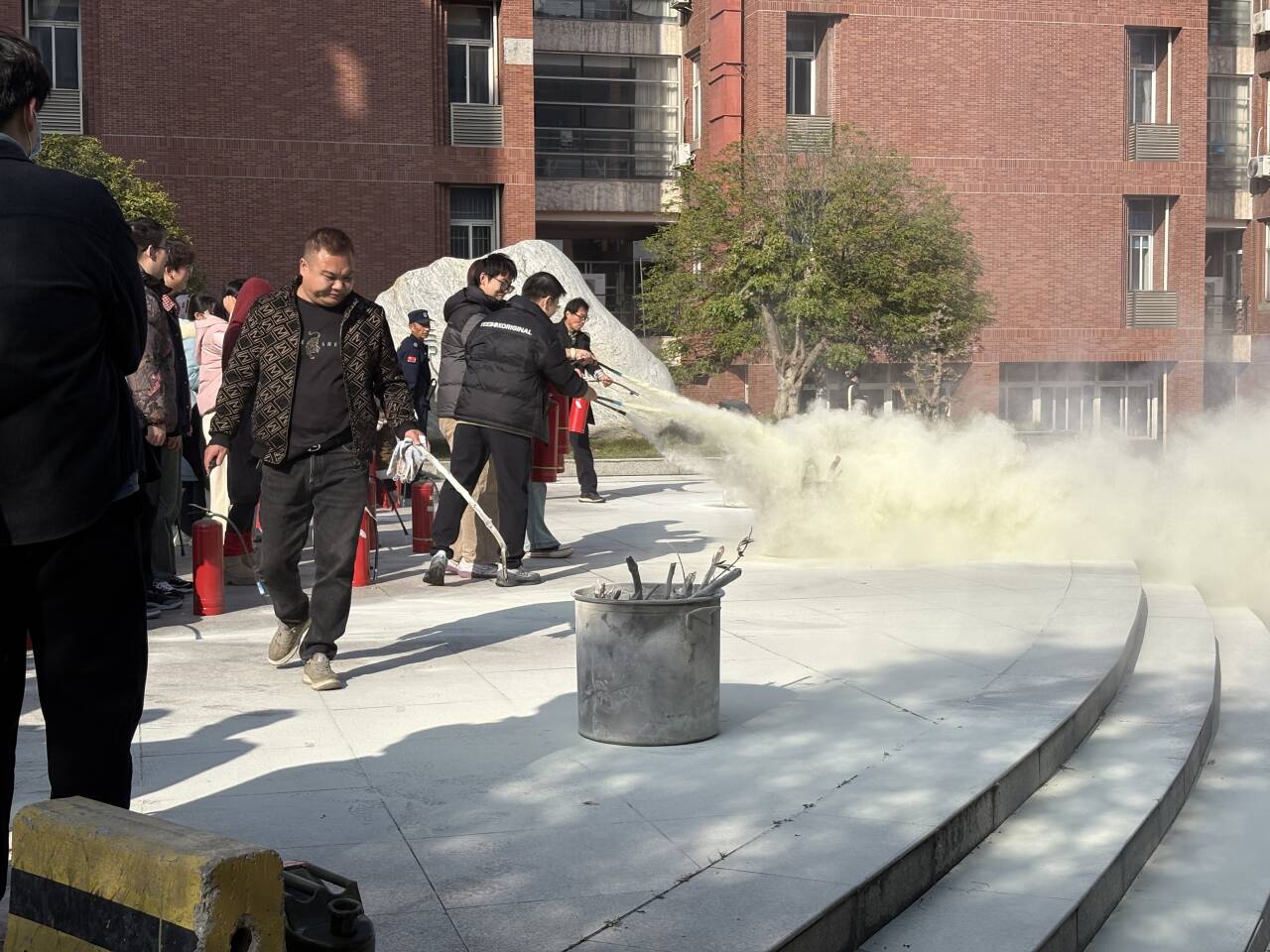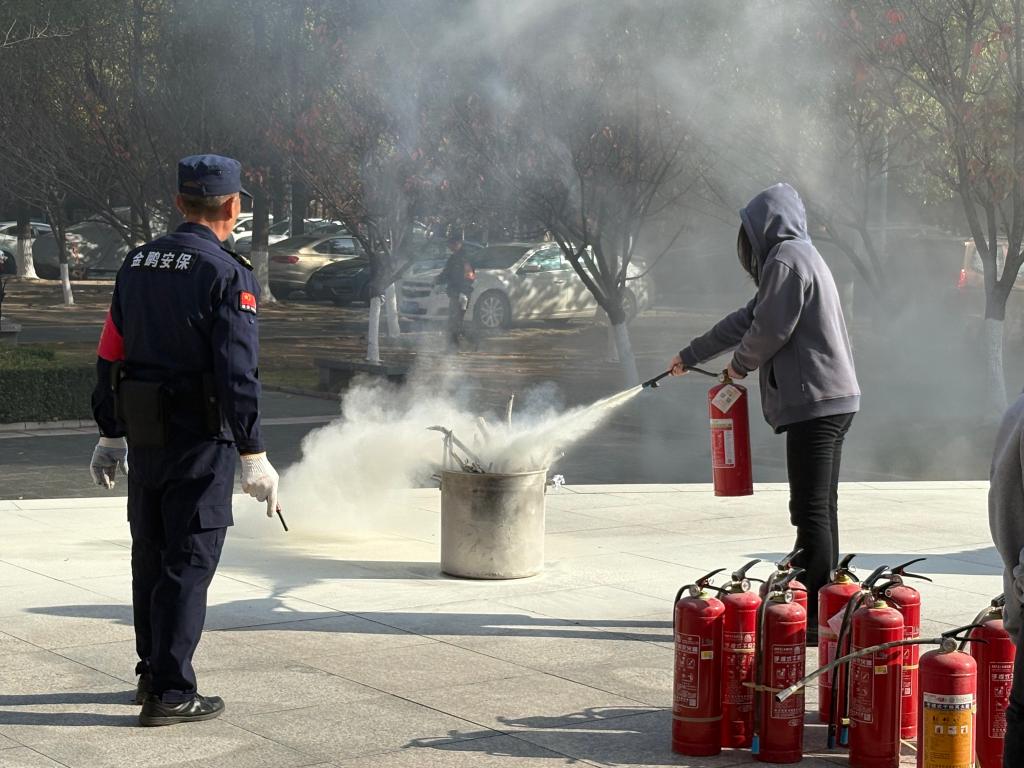 疏散环节结束后,公司保卫处万杨科长聚焦消防器材实操技能开展系统化教学。在14教室南广场的实操场地,保卫处老师详细演示了干粉灭火器、消防栓的核心构造与标准使用流程,逐一拆解“提瓶身、拔保险、握喷管、压手柄”的规范动作要领。针对研究生科研场景中可能遇到的电器火灾、化学试剂火灾等不同类型火情,专门讲解灭火器选型技巧与使用禁忌,明确“面对小火情切勿慌乱,保持1.5~2米安全距离,对准火焰根部持续喷射”的实操准则,并现场纠正常见操作误区。演示结束后,学子们分组轮流实操演练,工作人员全程一对一指导,确保每位同学都能亲身体验操作流程、熟练掌握实用技能。