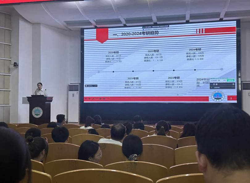 副经理肖围做2025届毕业生考研动员,并讲解2025年研究生报考政策。他就考研报名的注意事项进行了详细讲解,并对同学们提出了殷切希望,鼓励同学们树立适合自己的考研目标,提前规划、尽快行动,并分享了各种收集资料的渠道。