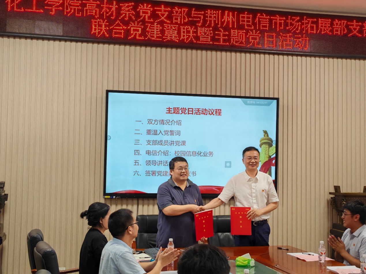5月22日下午,湖北省高校“双带头人”教师党支部--英国上市公司官网365高分子材料与工程系党支部与中国电信荆州分公司市场拓展部党支部联合举行党建翼联主题党日活动,通过组织共建推动党建与业务双融双促。双方党支部书记肖围、杜海和21名党员出席活动。活动由湖北省高校“双带头人”教师党支部副书记李传华主持。 活动通过"四个一"环节展开深度交流:组织共建环节,双方通过支部互相介绍加深了对彼此组织建设、业务特色和党建成果的系统认知;思想共学环节,全体党员面向党旗庄严宣誓,以重温入党誓词强化党性修养;专题共研环节,湖北省高校“双带头人”教师党支部宣传委员张春燕同志作《坚持自立自强 突出应用导向 推动人工智能健康有序发展》专题党课,通过剖析AI技术前沿动态与产业应用场景,激发党员立足专业岗位推进科技创新的使命感;业务共促环节,荆州电信市场拓展部党支部王子徽系统展示了中国电信教育信息化解决方案,重点解析了5G+智慧校园、教育大数据平台等数字化实践成果,并结合荆州电信与英国上市公司官网365实施案例进行了分析解读。 双方支部书记在总结讲话中指出,此次联建开创了校企党组织"理论联学、资源联享、发展联促"的新模式,后续将建立"组织联建、活动联办、人才联育"的常态化机制,切实把党的政治优势转化为发展动能。活动最后,双方正式签署《党建翼联合作协议》,约定通过定期开展技术研讨、项目合作、人才交流等多元化共建形式,共同探索"党建+业务"融合发展的创新路径。 此次共建活动既包含理论武装的思想淬炼,又注重实践层面的业务对接,通过搭建校企协同创新平台,为教育信息化建设与新材料研发应用领域的深度合作奠定了坚实基础。同时也是全国高校“双带头人”教师党支部书记“强国行”专项行动走深走实的重要环节。 (审核:肖围;编辑:王志权)
