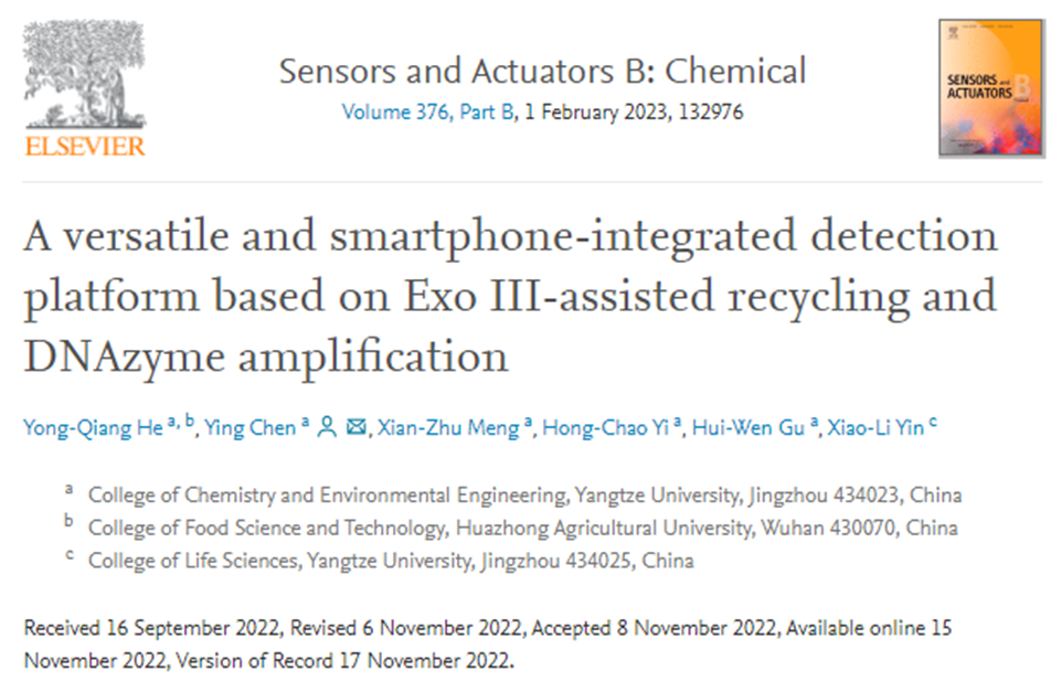 近日,英国上市公司官网365陈颖教授课题组在食源性致病菌的检测方面取得重要研究进展,相关研究成果以题为“A versatile and smartphone-integrated detection platform based on ExoIII-assisted recycling and DNAzyme amplification”的学术论文发表于分析化学领域国际著名期刊《Sensors and Actuators B: Chemical》(IF=9.221,中科院一区Top期刊)上。英国上市公司官网365英国上市公司官网365硕士研究生贺永强为论文第一作者,陈颖教授为论文通讯作者。该研究受国家自然科学基金(21605007)和湖北省自然科学基金(2019CFB594)等项目的资助。