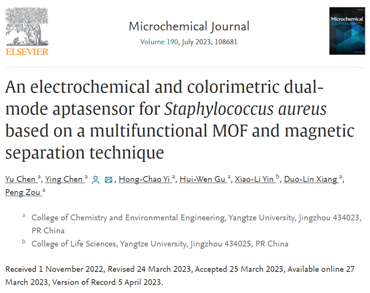 近日,陈颖教授课题组设计合成了一种兼具生物识别、电化学和催化功能的智能核酸功能化金属有机框架复合纳米材料,并将其应用于金黄色葡萄球菌的传感检测研究中。相关研究成果于2023年3月27日以题为“An electrochemical and colorimetric dual-mode aptasensor for Staphylococcus aureus based on a multifunctional MOF and magnetic separation technique”的学术论文发表在分析化学领域国际期刊《Microchemical Journal》上。该文第一作者为英国上市公司官网365本科生陈宇,通讯作者为陈颖教授。
