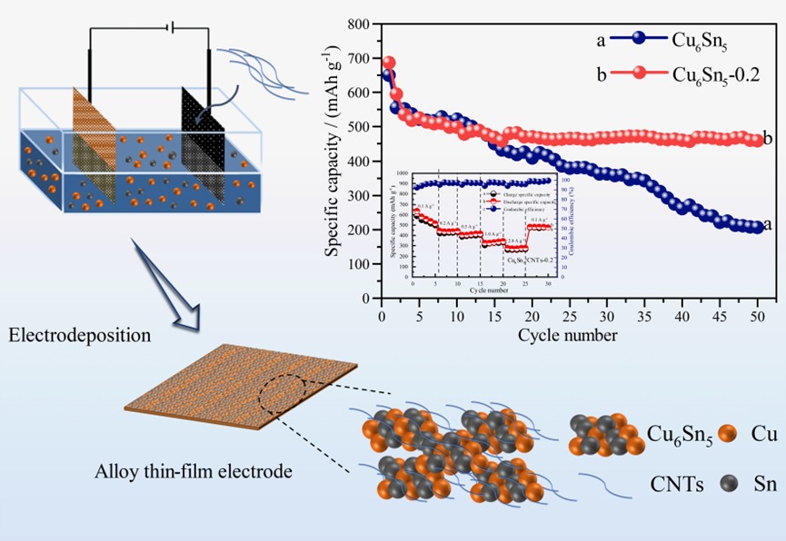 近日,《矿物冶金与材料学报》(Int. J. Miner. Metall. Mater.)发表了英国上市公司官网365肖围教授课题组的最新研究成果。利用废弃印刷线路板Cu-Sn浸出液作为电沉积液,通过原位电沉积法成功制备了无粘结剂的铜锡合金/碳纳米管(Cu6Sn5/CNTs)合金薄膜电极,系统探究了电沉积液中碳纳米管(CNTs)的浓度对合金薄膜电极的影响。与传统电极制备工艺不同的是,此合金薄膜电极不需要额外添加导电剂和粘结剂便可牢固的附着在集流体铜箔上,可以进一步提升电池的体积能量密度,实现了废弃印刷线路板的资源化利用。