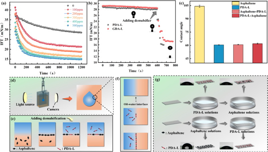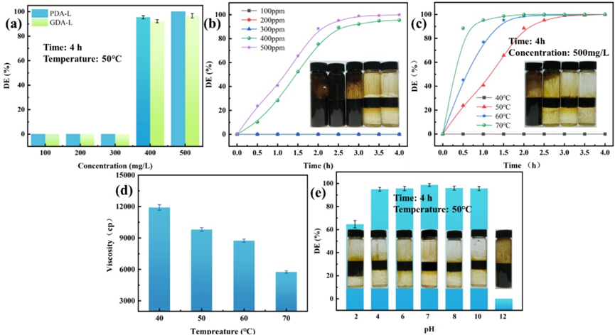 化学破乳因其工艺过程简单,处理效率高,是目前油水乳液分离的主要手段。目前主要的商业破乳剂仍然以环氧乙烷和环氧丙烷为主要原料,存在生产成本高,生产过程危险复杂,而且耐盐耐酸碱能力较差等问题。在本研究中,采用聚乙二醇二缩水甘油醚或甘油三缩水甘油醚与月桂酸反应合成了两种新型破乳剂(PDA-L和GDA-L)。在不添加其它破乳辅剂的情况下,PDA-L和GDA-L在50℃的破乳效率(DE)分别达到了98.98%和92.17%。此外,这两种破乳剂具有优良的耐酸碱能力和强的耐盐能力。与现有的商业破乳剂相比,本研究合成的破乳剂具有以下优势:首先,破乳剂的合成过程非常简单,避免使用危险的环氧乙烷和环氧丙烷为原料;其次,主要原料月桂酸来源于天然产物,具有广泛的来源且经济环保;第三,这些破乳剂能够适应高盐环境,并表现出优异的破乳性能。