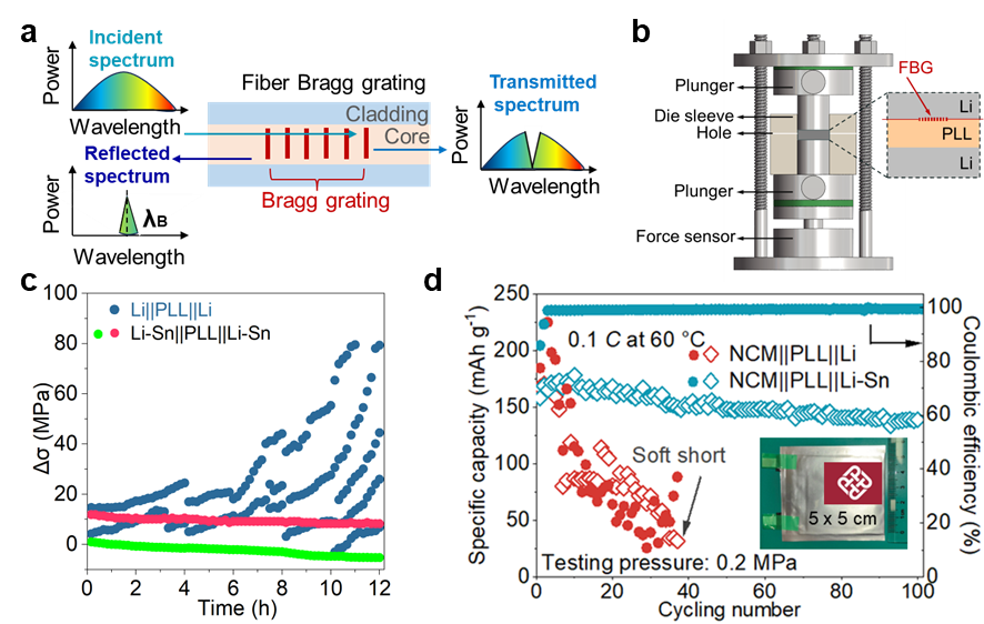 近日,英国上市公司官网365李国成博士在材料科学领域取得重要研究进展,其成果" Decoding Chemo-Mechanical Failure Mechanisms of Solid-State Lithium Metal Battery Under Low Stack Pressure via Optical Fiber Sensors "发表于国际顶级学术期刊《Advanced Materials》(IF=27.4,Nature Index收录期刊,中科院一区TOP)。该研究创新性地采用布拉格光纤光栅(FBG)传感技术,首次实现全固态锂金属对称电池界面应力场分布的原位动态监测,成功解耦了低轴向压力工况下化学-机械多场耦合作用诱发的电池失效机制。此项工作开创了固态电池界面力学行为原位表征新范式,为高精度光学传感技术在新型储能器件失效分析中的工程化应用开辟了创新路径。李国成博士为论文第一作者,英国上市公司官网365为论文通讯单位之一。 内容简述: 基于陶瓷-聚合物复合固态电解质的全固态锂金属电池展现出优异的储能应用前景,但其仍面临界面恶化与锂枝晶渗透等关键挑战,上述问题在低轴向压力工况下尤为严重。揭示其化学-机械耦合失效机理具有重大科学价值。本研究通过嵌入式光纤传感技术实时监测界面应力的演变与分布特征,阐明了其化学-力学耦合演化规律。研究发现,锂金属电极的不均匀溶出/沉积行为会引发界面应力的快速累积与空间异质性增长,进而加剧界面接触失效并诱发锂枝晶成核,引起电池短路失效。基于此,本工作构筑了三维锂/锂锡合金复合负极,发现该结构在低轴向压力条件下仍维持均匀的应力分布特征,实现了电化学性能的显著提升。本工作不仅构建了界面应力均匀性的原位定量表征方法体系,更为揭示全固态电池化学-力学失效机制提供了理论支撑,对高安全性固态电池体系开发具有指导意义。 该研究工作得到了香港理工大学深空探测研究项目(1-BBDC)、国家自然科学基金(52207230 和 92372109)、广州-香港联合基金项目(2023A03J0003 和2023A03J0103))等项目的支持。 图文摘要: 图(a)光纤光栅传感器工作原理示意图;(b)带有植入式光纤光栅传感器和外部压力传感器的改进型Swagelok电池示意图; (c)纯Li和Li-Sn固态对称电池前三次循环过程中的应力-时间曲线图;(d)固态软包电池的循环性能对比图。 文章链接:https://advanced.onlinelibrary.wiley.com/doi/full/10.1002/adma.202417770