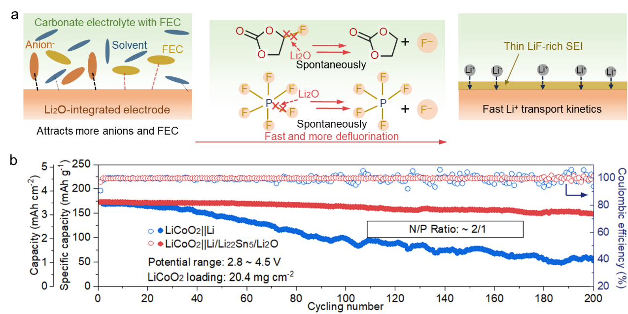 10月8日,英国上市公司官网365肖围教授课题组在高性能锂金属电池领域取得重要研究进展,其成果"Li2O-Integrated Electrodes Enabling Enhanced Adsorption/Defluorination Kinetics toward LiF-Rich Interphase for High-Performance Lithium Metal Batteries"发表于国际顶级学术期刊Advanced Functional Materials。该研究创新性地通过电极设计,集成对碳酸酯电解液中含氟组分吸附/去氟化能力强的纳米氧化物,在金属锂电极表面原位构筑了化学/电化学稳定的含氟保护层,改善了锂金属负极的电化学性能。李国成博士为论文第一作者,肖围教授为论文第一通讯作者,英国上市公司官网365为论文通讯第一单位。 内容简述: 锂金属负极因其极低的氧化还原电位和极高的理论比容量,被视为下一代高能量密度电池的理想选择。然而,其实际应用受限于较差的循环稳定性,主要归因于与碳酸酯电解液的高反应性。这种反应导致形成不稳定的固体电解质界面(SEI),在循环过程中易破裂,持续消耗活性锂和电解液。同时,天然SEI在组成、形貌和离子导率上的不均匀性会引发锂离子通量分布不均和成核位点杂乱,进而导致枝晶生长和电池短路。构建稳定均一的SEI层成为抑制副反应和枝晶问题的关键。研究发现,富含LiF等无机成分的SEI可有效提升界面稳定性。现有策略(如高浓度电解液、添加剂和表面修饰)主要通过调控电解液组成或界面化学来促进含氟物种分解生成LiF,但往往依赖复杂配方或精密工艺。相比之下,从电极设计入手,开发能高效吸附并促进含氟组分去氟化的新方法,为构建稳定富LiF界面提供了更具潜力的替代路径。 本研究提出了一种通过调控复合电极对含氟电解质组分的吸附与去氟化动力学,以定向构筑富LiF界面的新策略。采用机械化学方法,在Li/Li22Sn5复合电极中实现了Li2O纳米颗粒的原位、均匀嵌入。研究表明,Li2O对PF6⁻和氟代碳酸亚乙酯(FEC)具有强吸附能力,可加速其自发去氟化过程,进而引导形成以阴离子/FEC衍生物为主的富LiF 固体电解质界面。结合光谱学表征与理论计算,证实了Li22Sn5表面对含氟物种具有优先吸附与去氟化促进作用具有优先吸附与去氟化促进作用,揭示了该界面结构的形成机制。同时,稳定的Li22Sn5合金骨架有助于引导均匀锂沉积并缓冲体积变化,与Li2O协同增强电极稳定性。该复合负极在碳酸酯电解液中实现50次循环内平均库仑效率99.0%。与LiCoO2正极组装的完整电池在苛刻条件(N/P = 2:1,贫电解液20 μL)下表现出优异的循环稳定性,面容量为3.3 mAh cm⁻2,200周后容量保持率达87.0%;180 mAh软包电池在100次循环后仍保持78.2%的容量,充分证明了该电极设计策略的实际应用潜力。 该研究工作得到了国家自然科学基金(52272207和52274292)、北京自然科学基金(2192029)、湖北省杰出青年基金(2020CFA090)等项目的支持。 图文摘要: 图(a)Li/Li22Sn5/Li2O电极吸附/去氟化构筑富含LiF固态电解质界面层示意图;(b)LiCoO2||Li/Li22Sn5/Li2O、LiCoO2||Li电池循环性能对比图。 文章链接:https://advanced.onlinelibrary.wiley.com/doi/epdf/10.1002/adfm.202523194 (审核:肖围 编辑:常艳玲)